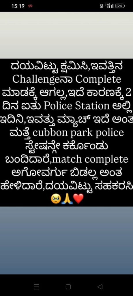ವಿಡಿಯೋ ವೈರಲ್ ಆಗುತ್ತಿದ್ದಂತೆ ಮುನ್ನೆಚ್ಚರಿಕ ಕ್ರಮವಾಗಿ ವಶಕ್ಕೆ ಪಡೆದಿರುವ ಕಬ್ಬನ್ ಪಾರ್ಕ್ ಪೊಲೀಸರು, ಪಾಠ ಮಾಡಿದ್ದಾರೆ. ಅಲ್ಲದೇ, ಪಂದ್ಯ ಮುಗಿಯುವವರೆಗೂ ಹೊರಗೆ ಬಿಡುವುದಿಲ್ಲ ಎಂದು ಪೊಲೀಸರು ಎಚ್ಚರಿಕೆ ನೀಡಿದ್ದಾರೆ. ಹೀಗಾಗಿ ಯುವಕ ಶರಣ್, ಇನ್ಸ್ಟಾಗ್ರಾಂನಲ್ಲಿ ತಪ್ಪಾಯ್ತು ಅಂತ ವಿಡಿಯೋ ಮಾಡಿದ್ದಾನೆ. ಜೊತೆಗೆ ಇವತ್ತು ಮ್ಯಾಚ್ ಮುಗಿಯುವರೆಗೆ ಠಾಣೆಯಲ್ಲೇ ಇರುತ್ತೇನೆ ಎಂದು ಸ್ಟೋರಿ ಹಾಕಿದ್ದಾನೆ.