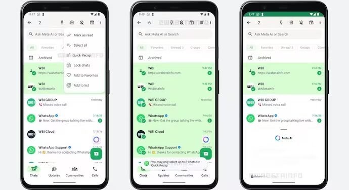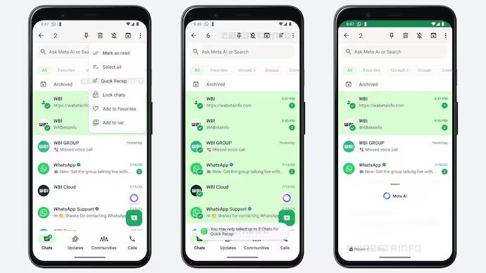 • ಬಳಕೆ ಹೇಗೆ? ವರದಿಗಳ ಪ್ರಕಾರ, ಬಳಕೆದಾರರು ತಮ್ಮ ಚಾಟ್ಸ್ ಟ್ಯಾಬ್‌ನಲ್ಲಿ ಕೆಲವು ಚಾಟ್‌ಗಳನ್ನು ದೀರ್ಘವಾಗಿ ಒತ್ತಿ ಆಯ್ಕೆ ಮಾಡಿದ ನಂತರ, ಮೇಲಿನ ಬಲ ಮೂಲೆಯಲ್ಲಿ ಕಾಣುವ ಮೂರು-ಡಾಟ್ ಮೆನುವಿನಲ್ಲಿ ‘ಕ್ವಿಕ್ ರಿಕ್ಯಾಪ್’ ಎಂಬ ಹೊಸ ಆಯ್ಕೆ ಕಾಣಿಸಿಕೊಳ್ಳಲಿದೆ. ಅದನ್ನು ಟ್ಯಾಪ್ ಮಾಡಿದ ತಕ್ಷಣ, ಮೆಟಾದ AI ತಂತ್ರಜ್ಞಾನವು ಆಯ್ದ ಚಾಟ್‌ಗಳ ಸಾರಾಂಶವನ್ನು ಸಿದ್ಧಪಡಿಸುತ್ತದೆ.