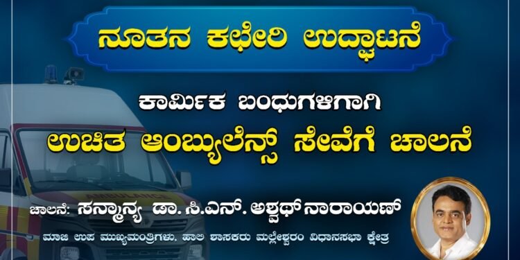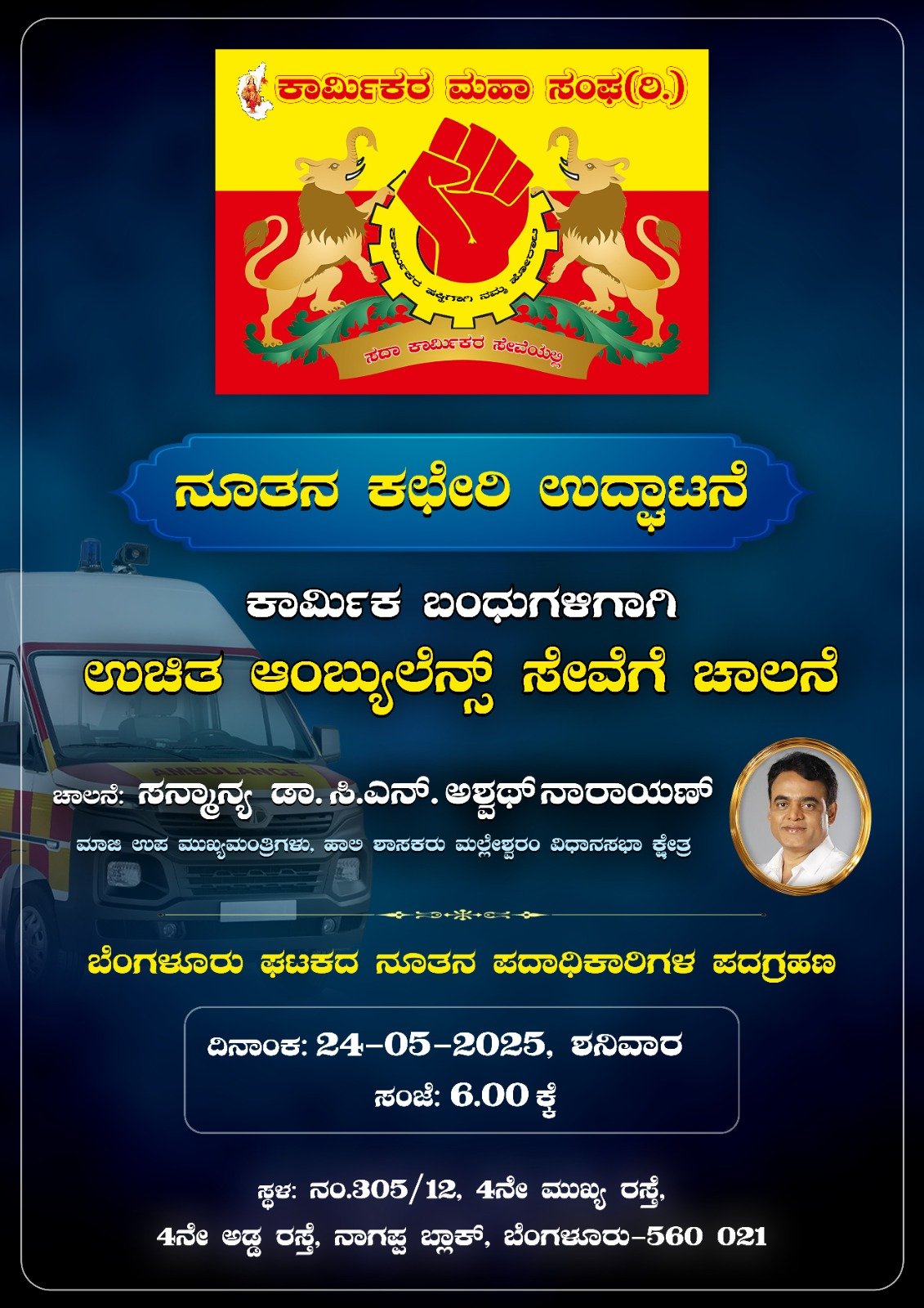 ಕಾರ್ಮಿಕರ ಮಹಾ ಸಂಘದ ನೂತನ ಕಚೇರಿ ಉದ್ಘಾಟನೆ ಹಾಗೂ ಕಾರ್ಮಿಕ ಬಂಧುಗಳಿಗಾಗಿ ಉಚಿತ ಆಂಬುಲೆನ್ಸ್ ಸೇವೆಗೆ ಚಾಲನೆ ನೀಡುವ ಕಾರ್ಯಕ್ರಮ ಮೇ 24ರಂದು ಸಂಜೆ 6ಕ್ಕೆ ಬೆಂಗಳೂರಿನ ನಾಗಪ್ಪ ಬ್ಲಾಕ್ 4ನೇ ಅಡ್ಡ ರಸ್ತೆಯ 4ನೇ ಮುಖ್ಯ ರಸ್ತೆಯಲ್ಲಿ ನಡೆಯಲಿದೆ.