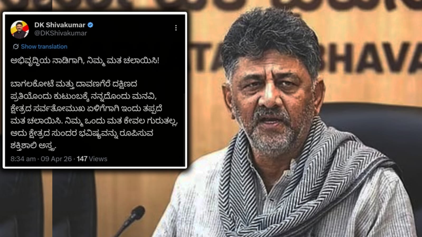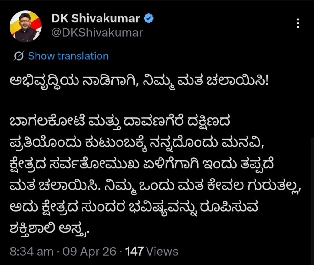 “ನಿಮ್ಮ ಮತವು ಕೇವಲ ಗುರುತು ಮಾತ್ರವಲ್ಲ, ಅದು ಕ್ಷೇತ್ರದ ಭವಿಷ್ಯ ರೂಪಿಸುವ ಶಕ್ತಿಶಾಲಿ ಅಸ್ತ್ರ,” ಎಂದು ಹೇಳುವ ಮೂಲಕ ಮತದಾನದ ಮಹತ್ವವನ್ನು ಡಿಸಿಎಂ ಒತ್ತಿಹೇಳಿದ್ದಾರೆ. ಮತದಾರರು ಹೆಚ್ಚಿನ ಸಂಖ್ಯೆಯಲ್ಲಿ ಭಾಗವಹಿಸಿ ಪ್ರಜಾಪ್ರಭುತ್ವದ ಹಬ್ಬವನ್ನು ಯಶಸ್ವಿಗೊಳಿಸಬೇಕು ಎಂದು ಅವರು ಕರೆ ನೀಡಿದ್ದಾರೆ.