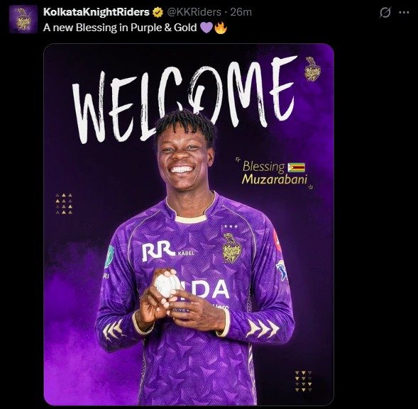 ಬಾಂಗ್ಲಾದೇಶದ ಸ್ಟಾರ್ ವೇಗದ ಬೌಲರ್ ಮುಸ್ತಾಫಿಜುರ್ ರೆಹಮಾನ್ ಅವರನ್ನು ತಂಡದಿಂದ ಕೈಬಿಟ್ಟಿರುವ ಕೆಕೆಆರ್ ಆಡಳಿತ ಮಂಡಳಿಯು, ಅವರ ಸ್ಥಾನಕ್ಕೆ ಜಿಂಬಾಬ್ವೆಯ ತಾರಾ ವೇಗಿ ಬ್ಲೆಸ್ಸಿಂಗ್ ಮುಜರಬಾನಿ ಅವರನ್ನು ಅಧಿಕೃತವಾಗಿ ಸೇರ್ಪಡೆಗೊಳಿಸಿಕೊಂಡಿದೆ. ಮಾರ್ಚ್ 13ರಂದು ಈ ಕುರಿತು ಪ್ರಕಟಣೆ ಹೊರಡಿಸಲಾಗಿದ್ದು, ಮುಜರಬಾನಿ ಮಾರ್ಚ್ 17ರಂದು ಕೆಕೆಆರ್ ಪಡೆಯನ್ನು ಸೇರಿಕೊಳ್ಳಲಿದ್ದಾರೆ.